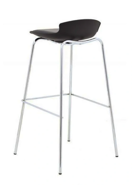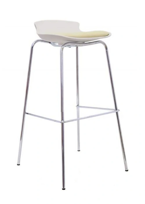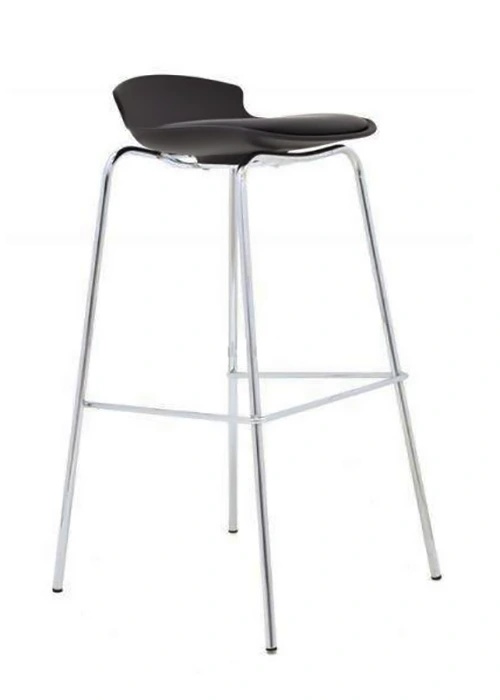 Asiento tapizado en cuerina. Dispone de un reposa pies cromado integrado. Usado en líneas de cocina, hotelería, bares, centros de belleza o como elemento decorativo.