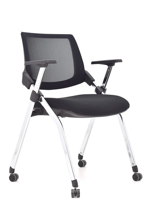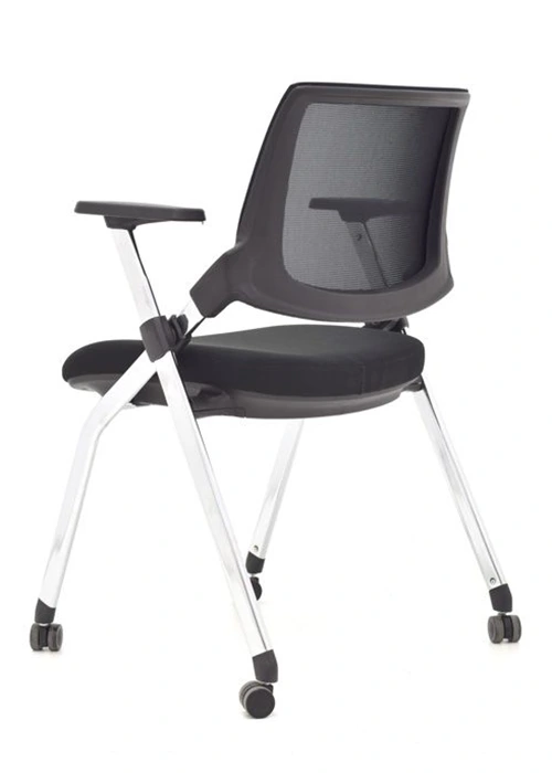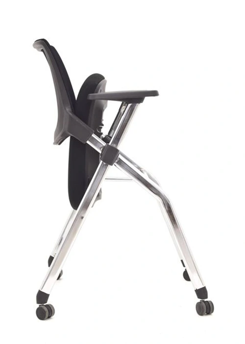 Espaldar tapizado en malla negra con borde de pvc negro. Asiento inyectado tapizado en tela negra. Cobertor plástico del asiento (plastic seat). Estructura metálica pintada color aluminio. Protector de pvc en los apoyabrazos.