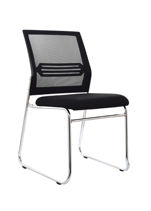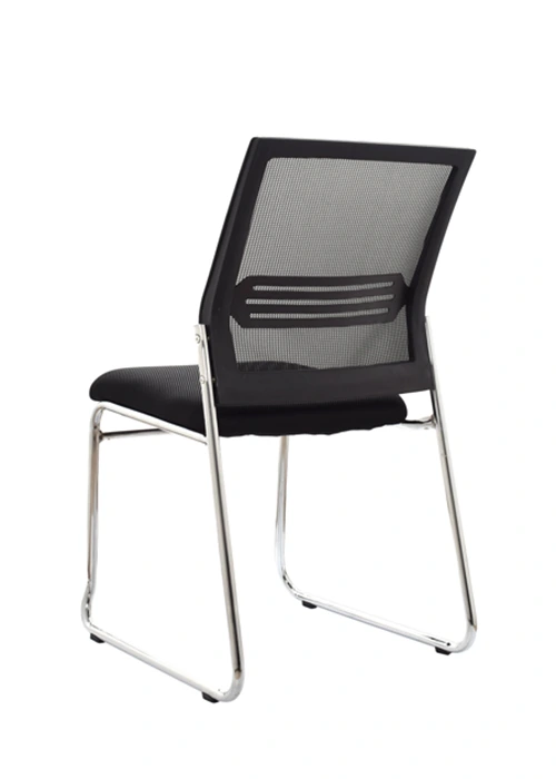 Espaldar en malla con apoyo lumbar fijo Asiento tapizado en paño negro importado Estructura tipo trineo cromado